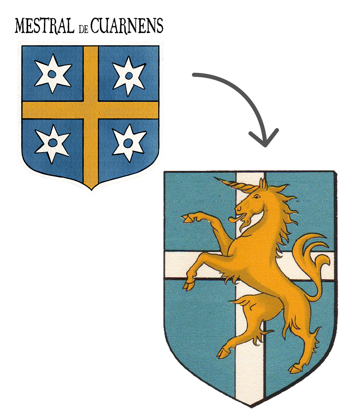 La commune a remplacé les molettes qui accompagnaient la croix par une licorne, provenant d’une vieille enseigne. Cette modification rendit ces armoiries parlantes, car Cuarnens était jadis prononcé « Cornens ».